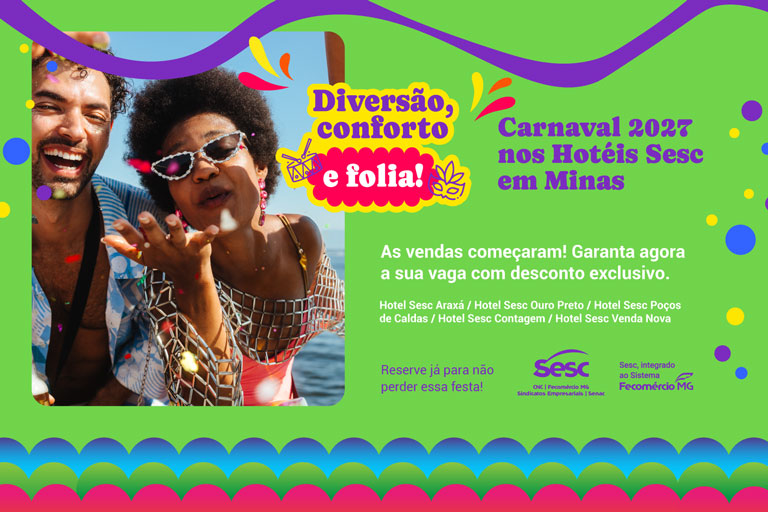 Prepare-se para o Carnaval 2027 garantindo sua hospedagem nos Hotéis Sesc em Minas! O Sistema Fecomércio MG disponibilizará pacotes com condições especiais para o período de 5 a 10 de fevereiro de 2027.